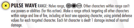 Para utilizar Pulse Wave (asumiendo que el personaje tenga acceso a este poder, ya sea por tenerlo en su dial o porque algún otro efecto le permite usarlo), el personaje debe utilizar una acción RANGE (ya sea desde el cuadro en que se encuentra o por obtenerla al usar Running Shot o algún similar), al momento de darle la acción al personaje este reemplaza su valor de rango a la mitad, obtiene una mejora de puntería para ignorar personajes al apuntar y otra mejora para poder hacer ataques a distancia aunque esté adyacente a un rival (todo esto solo mientras se ejecuta esta acción). Ahora que nuestro rango es solo la mitad, todos los personajes que se encuentren dentro de este no podrán tener acceso a sus poderes ni habilidades (exceptuando los que tengan Protected: Pulse Wave) durante esta acción, esto afecta tanto a aliados como oponentes. Ahora que ya todos los personajes dentro del rango reducido que mencionamos no tienen acceso a sus poderes ni habilidades, nuestro personaje realizará un ataque, el cual tendrá como objetivo a todos los demás personajes dentro del rango mencionado, también incluyendo a los aliados, pero necesariamente teniendo a un enemigo dentro de los personajes objetivos (lo que impide usar Pulse Wave para atacar solo a aliados). Este ataque considera tanto reemplazos como modificadores en los valores del atacante, PERO, los personajes objetivos solo cuentan con su defensa impresa para enfrentarlo, por lo que da igual que tengan algún efecto que aumente o disminuya dicha defensa, pues este será ignorado. Ahora viene uno de los cambios mas importantes, y que hizo que muchos dejaran de considerar Pulse Wave como un buen poder, y es que da igual que se ataque a uno o a diez personajes a la vez, Pulse Wave ya no considera el daño de nuestro personaje, sino que cada personaje (aunque sea un único objetivo) recibirá solo 1 daño de este ataque.