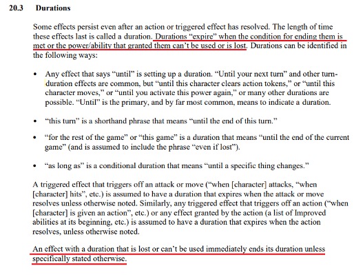 Bien, para hablar de esto tenemos que entender un poco las reglas de “duraciones” en los efectos. La definición de esto la podemos encontrar en la sección 20.3 del libro de reglas, pero en resumen dice lo siguiente: “Algunos efectos persisten incluso después de que una acción o efecto disparado se resuelve. Una duración “expira” cuando la condición para finalizarla es cumplida o si el Poder/Habilidad que la otorgan no puede usarse o es perdida.”