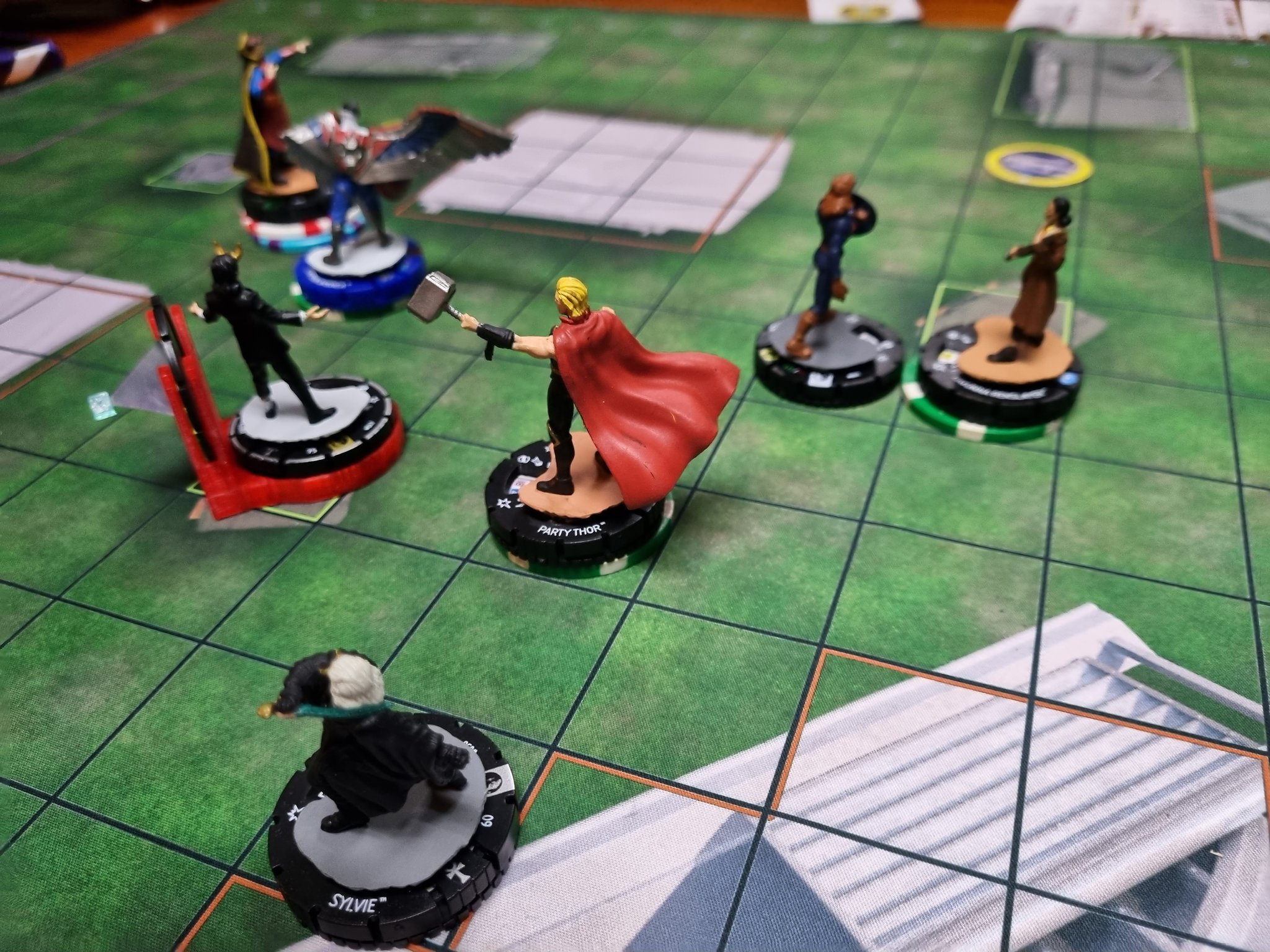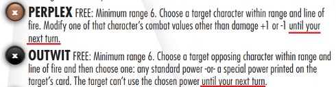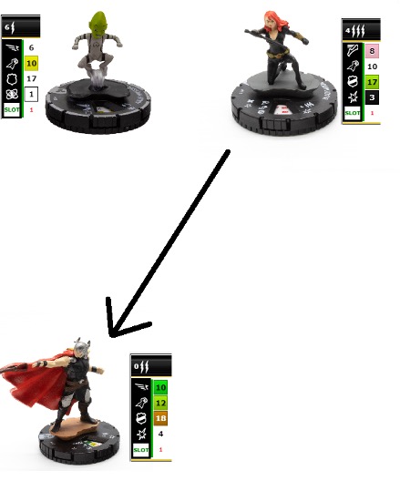La Black Widow de nuestro rival en su turno usa Outwit para que nuestro Thor no pueda usar Carga hasta su próximo turno, por lo que no podría llegar a atacarla en nuestro turno al no estar adyacente a ella. Comienza nuestro turno, nuestro Adolf Impossible está a 3 cuadro de Black Widow, así que decidimos usar Pulse Wave con él. Nuestro Pulso impide que Black Widow puede usar cualquier poder o habilidad, por ende, no puede usar su Outwit durante esta acción, lo que ocasiona que la duración de su efecto, en vez de durar hasta su siguiente turno, expire inmediatamente. Adolf realiza su tirada de ataque y consigue una suma de 5 en sus dados, por lo que no logra dañar a Black Widow, nuestro Pulse Wave ha finalizado. ¿Qué ocurre con el efecto del Outwit entonces?, pues, aunque el Outwit de nuestra Widow oponente vuelve a estar “disponible” dentro de sus facultades, el efecto de este poder que hacía que Thor no tuviera su carga, en vez de durar hasta su próximo turno, finalizó al momento de estar dentro del rango de Pulse Wave (sin importar que nuestro Adolf no lograra dañar a Widow.), por lo que ahora, finalizado el Pulse Wave, Thor cuenta nuevamente con su carga para ir a martillar la cabeza de Natasha.