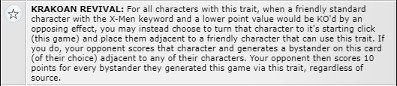 Si un personaje con el trait de Krakoan Revival se encuentra dentro del rango de Pulse Wave durante el mismo ataque en que un aliado podría ser “salvado” por este trait, ese aliado morirá irremediablemente debido a que no será posible usar el efecto de Krakoan Revival en el instante de su muerte.