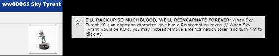 Sky Tyrant Chase de la edición WW80, este personaje obtiene marcadores de Reincarnation al matar personajes oponentes. Al momento en que va a morir puede removerse 1 de estos marcadores para sobrevivir a esa muerte. En caso de que esa muerte fuera a ser causada por Pulse Wave, Sky Tyrant no contará con dicho trait, por lo que no podrá acceder a este beneficio y también morirá irremediablemente.