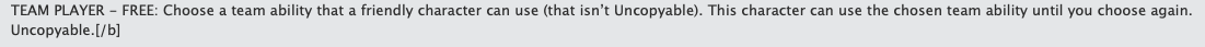 Contra Team Player team ability (o Wild Card), los personajes que hayan copiado una team ability por este efecto, al estar dentro de rango de Pulse Wave pierden la team ability copiada y para recuperarla deberán volver a utilizar la FREE en su turno (en caso de que esta siga disponible en su equipo).